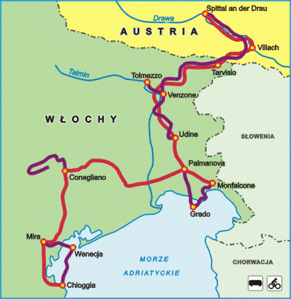 Wspaniałym sposobem na to będzie przemierzenie części słynnej w całej Europie trasy Alpe-Adria - czyli spośród alpejskich szczytów i dolin nad wybrzeża Adriatyku. Rozpoczniemy ją już w Austrii, aby zakończyć w nadmorskim Grado. Na tym jednak nie skończymy i przeniesiemy się w rejony winnic prosecco gdzie poza jazdą na rowerze zakosztujemy w lokalnym winie i kuchni. Ukoronowaniem wyjazdu będzie wizyta w Wenecji - mieście na wodzie.
