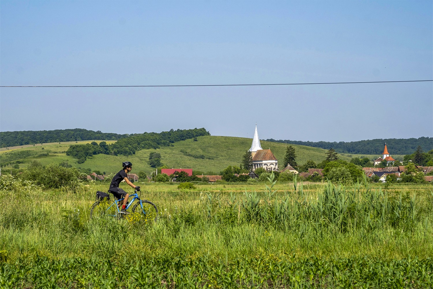 Przyjazd do Sighișoary w godzinach porannych. Zakwaterowanie i czas na odpoczynek po podróży. Po południu pierwsza wycieczka rowerowa, krótka, rozgrzewkowa trasa po mieście i okolicznych wzgórzach, polnych drogach, częściowo biegnących malowniczym szlakiem Via Transilvanica, przez łagodne wzniesienia i sady, otwierając pierwsze panoramiczne widoki na region Siedmiogrodu.