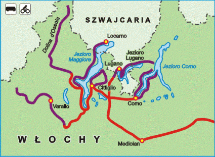 Zapraszamy na wycieczkę rowerową w bardzo malowniczy region, leżący na pograniczu Włoch i Szwajcarii. Odwiedzimy Piemont, Lombardię oraz włoskojęzyczny kanton Ticino. Nasze trasy rowerowe poprowadzone są dolinami górskimi i biegną wzdłuż rzek lub brzegów ogromnych jezior polodowcowych. Widoki na bezkresną taflę wody i odbijające się w niej wysokie górskie pasma o bardzo stromych zboczach na długo pozostaną w pamięci. Ukształtowanie terenu oraz możliwość podziwiania wspaniałych widoków na terytorium zarówno Szwajcarii jak i Włoch, stwarzają świetne warunki do uprawiania turystyki rowerowej.